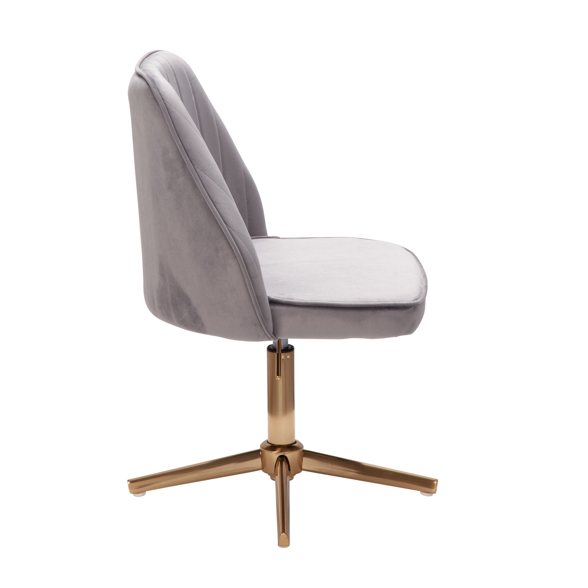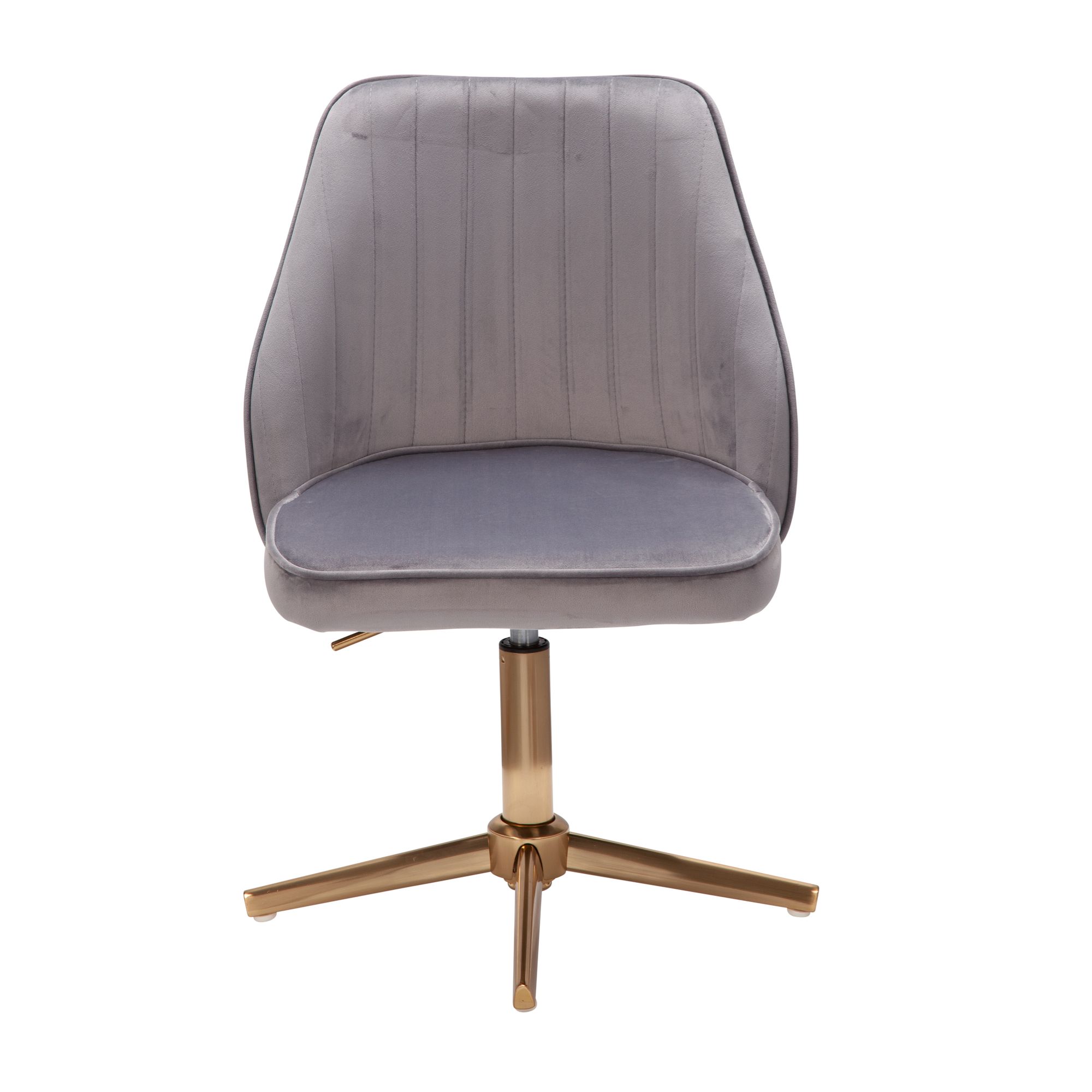 Grijze fluwelen bureaustoel met gouden metalen voet, die moderne vormgeving combineert met ergonomisch zitcomfort. De gevormde zitschaal biedt goede ondersteuning en kan 360° draaien voor optimale bewegingsvrijheid.