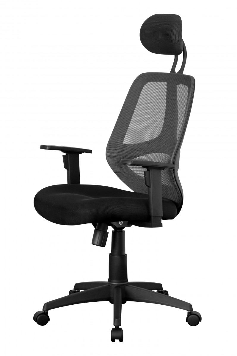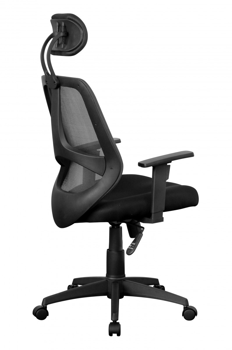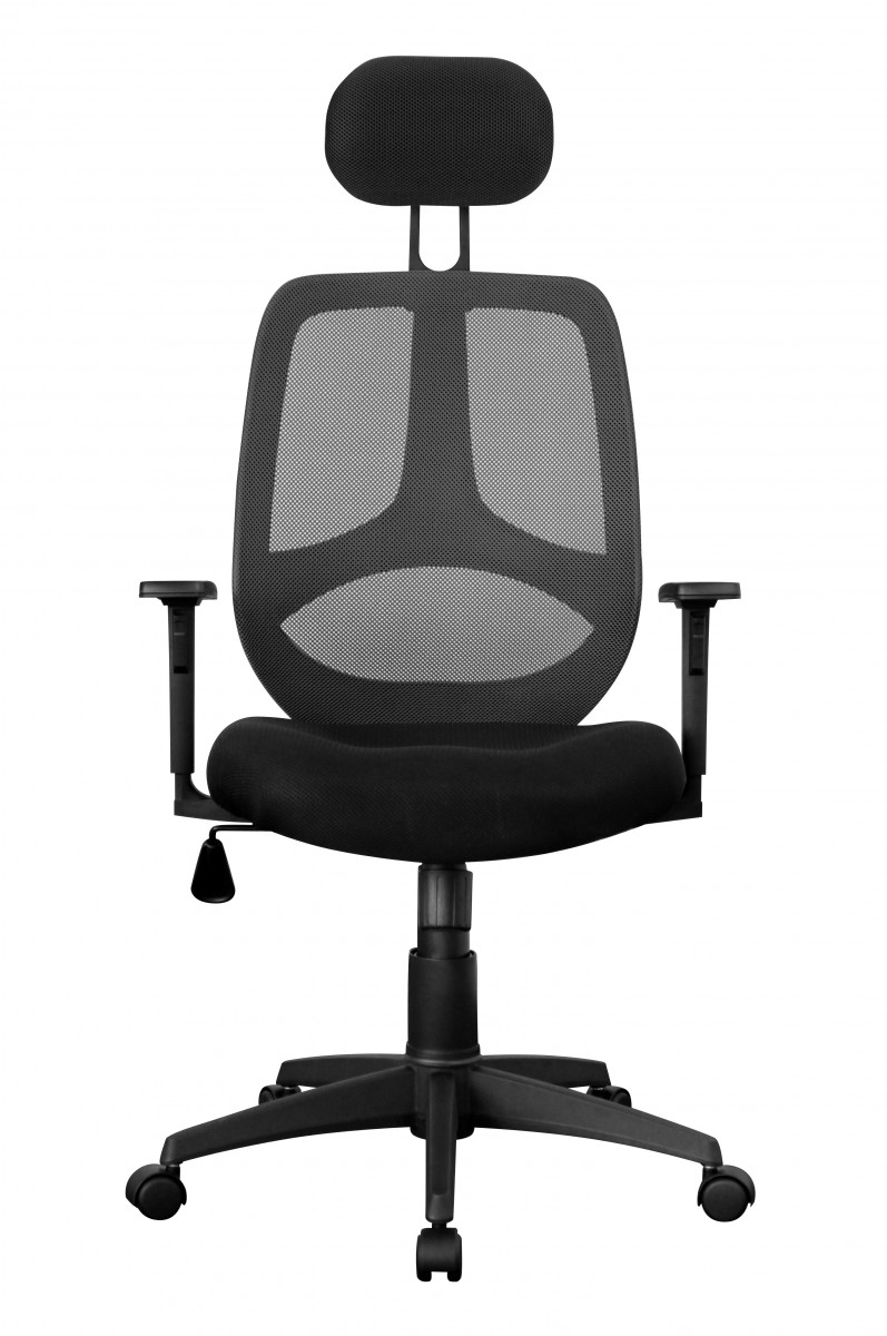 Ergonomische bureaustoel met zwarte stofbekleding, geschikt voor maximaal 8 uur comfortabel gebruik per dag. Voorzien van goed gewatteerde zitting, in hoogte verstelbare hoofdsteun en armleuningen, met lendensteun via ademende mesh rugleuning.