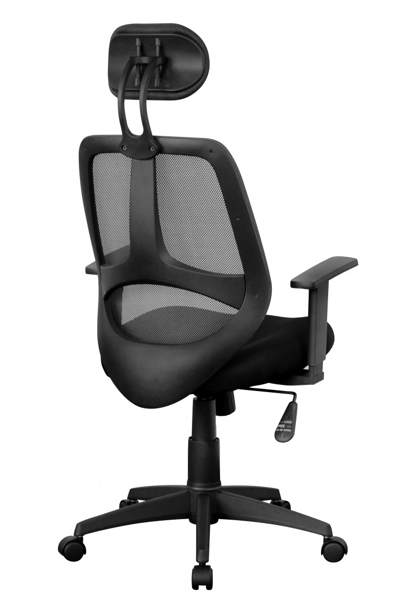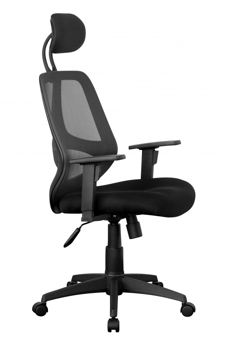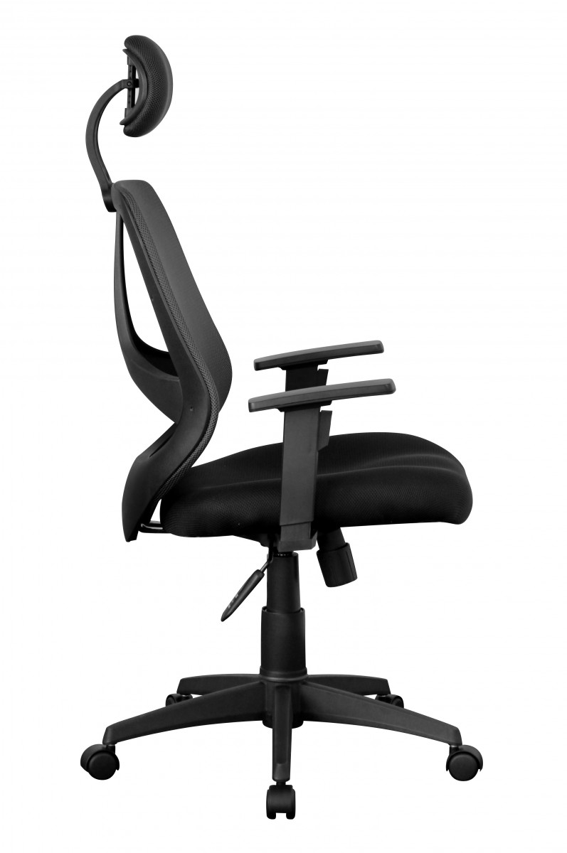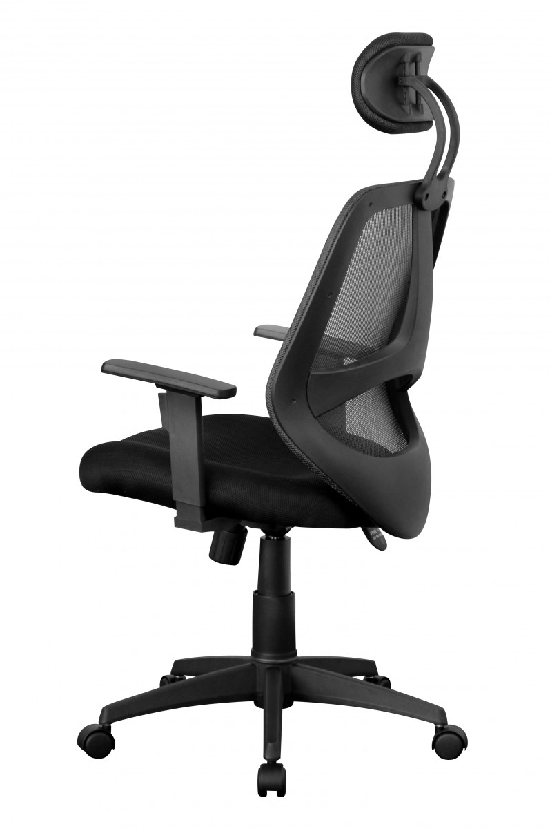 Ergonomische bureaustoel met zwarte stofbekleding, geschikt voor maximaal 8 uur comfortabel gebruik per dag. Voorzien van goed gewatteerde zitting, in hoogte verstelbare hoofdsteun en armleuningen, met lendensteun via ademende mesh rugleuning.