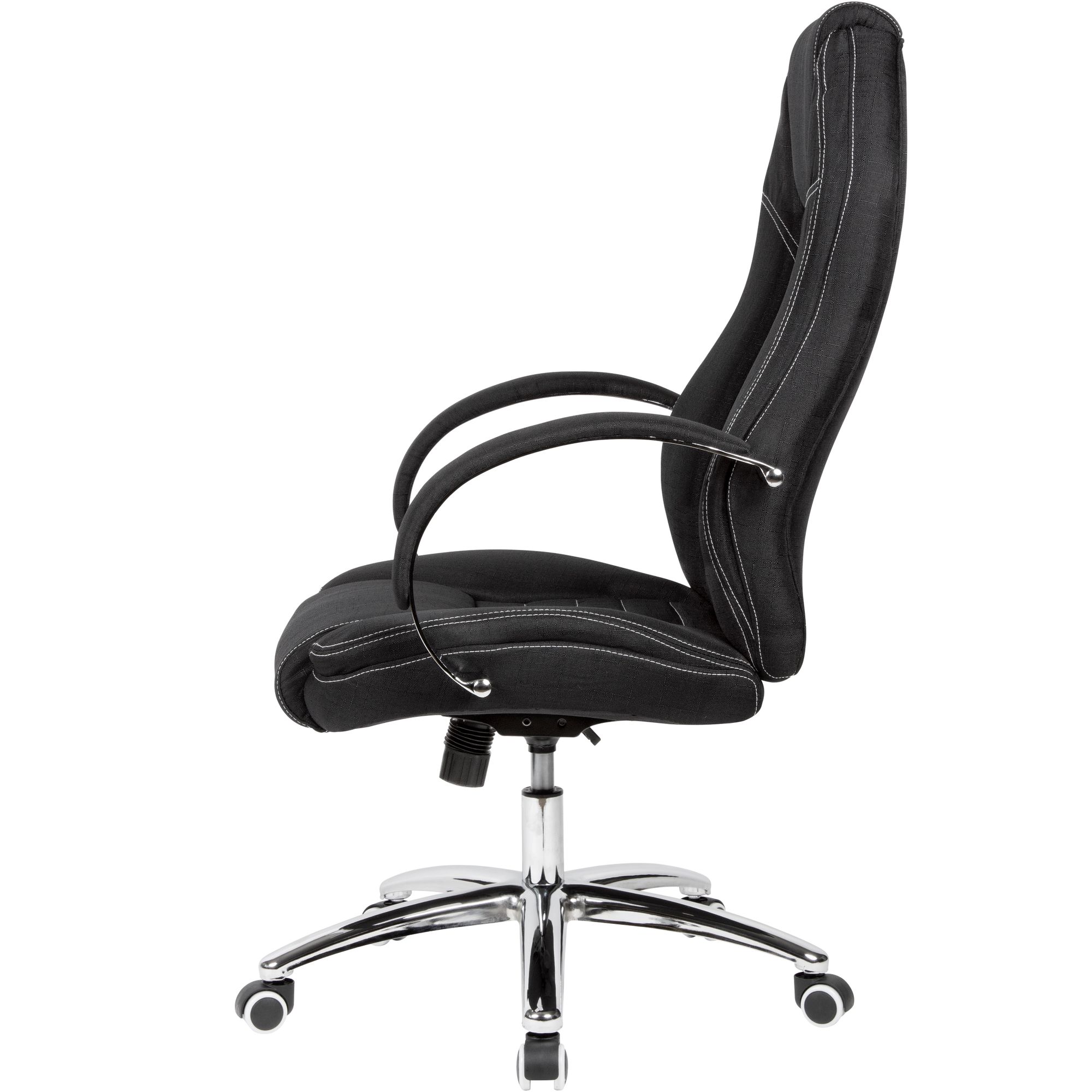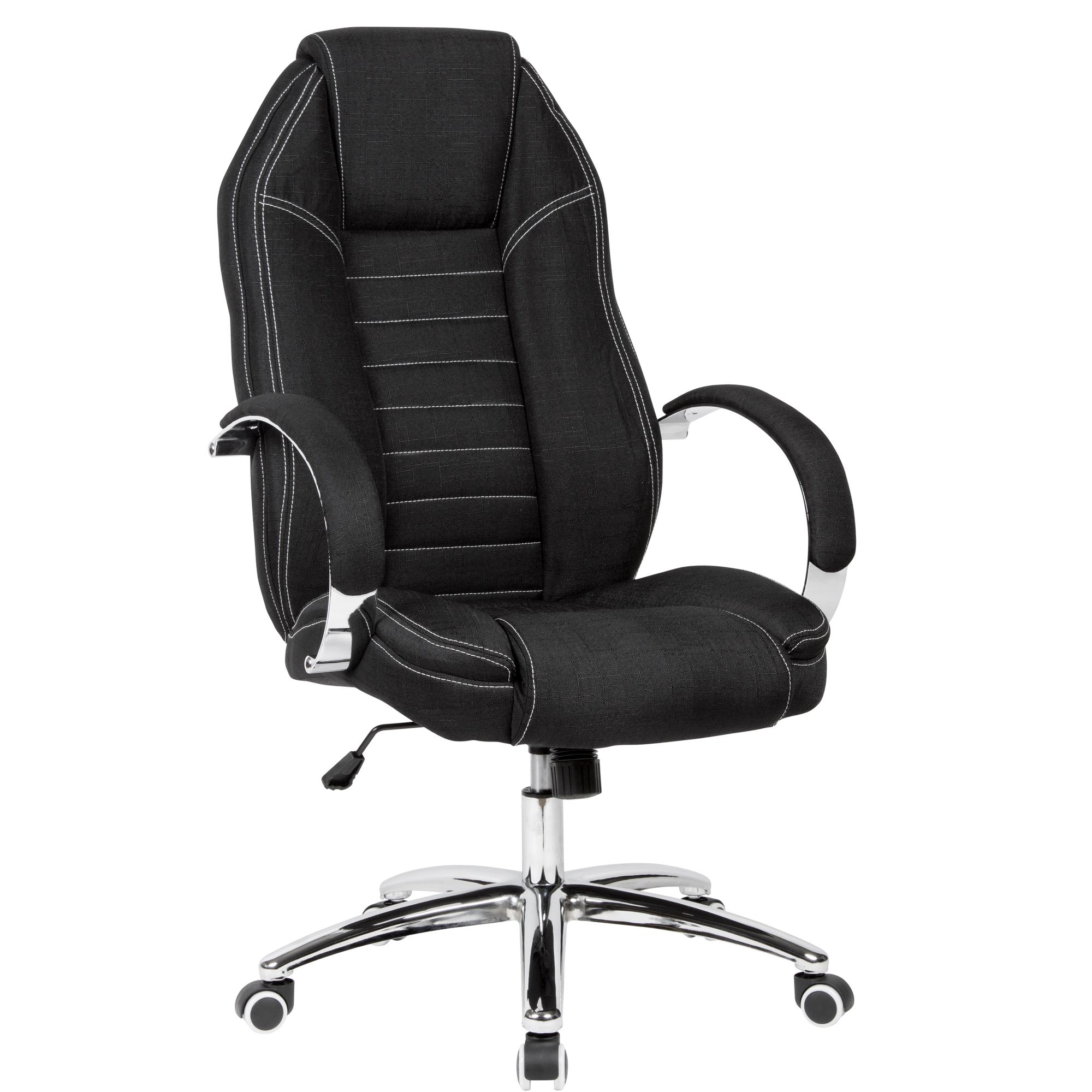 Deze draaibare bureaustoel met zwarte jeansstof biedt uitstekend comfort dankzij de zachte vulling en witte contraststiksels. Het is in hoogte verstelbaar en heeft een hoge rugleuning voor een ergonomische zit.