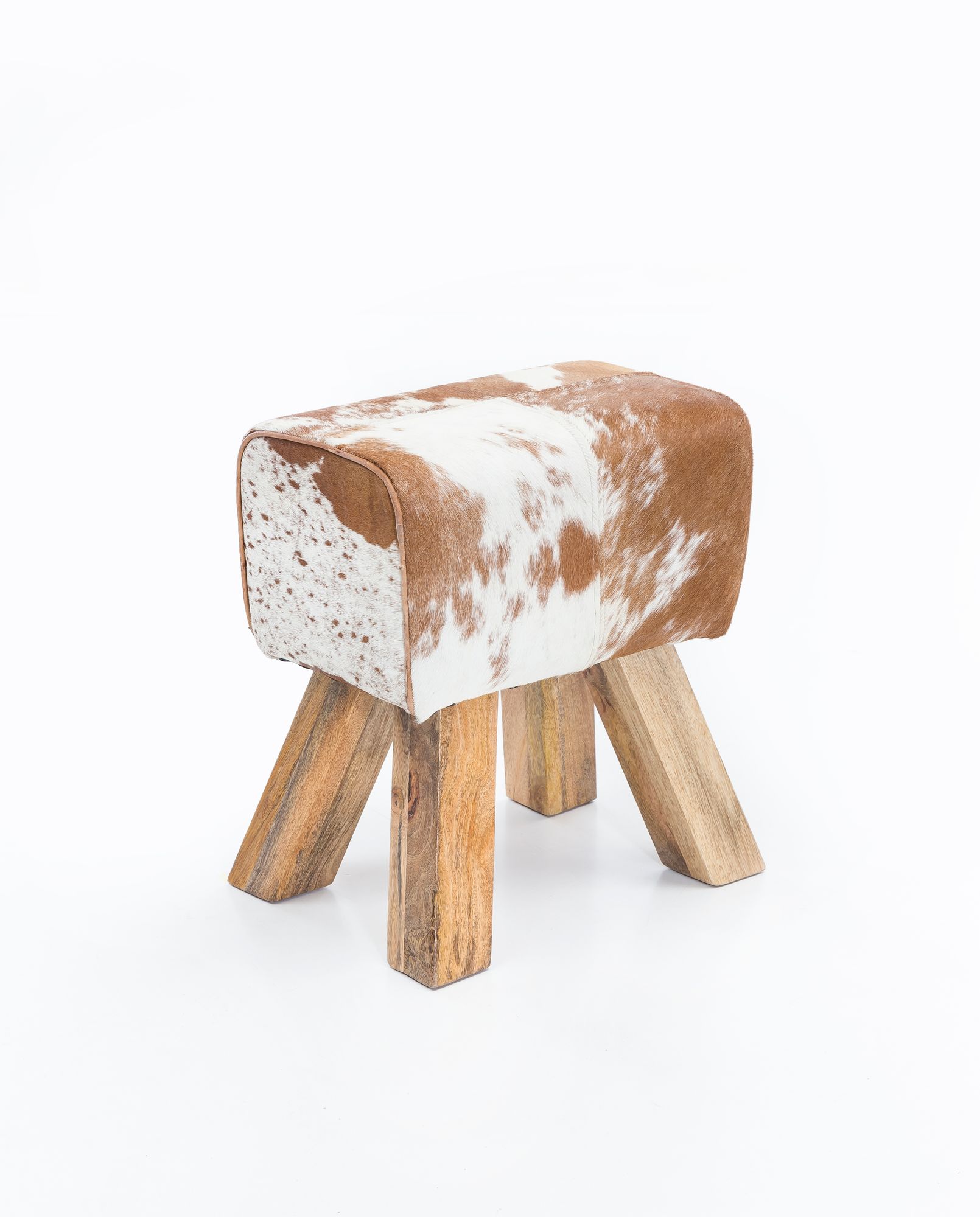 Ervaar de Turnbock design kruk met haarleer in bruin/wit, die rustieke charme en comfort combineert. De vier massief mangohouten poten zorgen voor uitstekende stabiliteit en duurzaamheid, ideaal voor dagelijks gebruik.