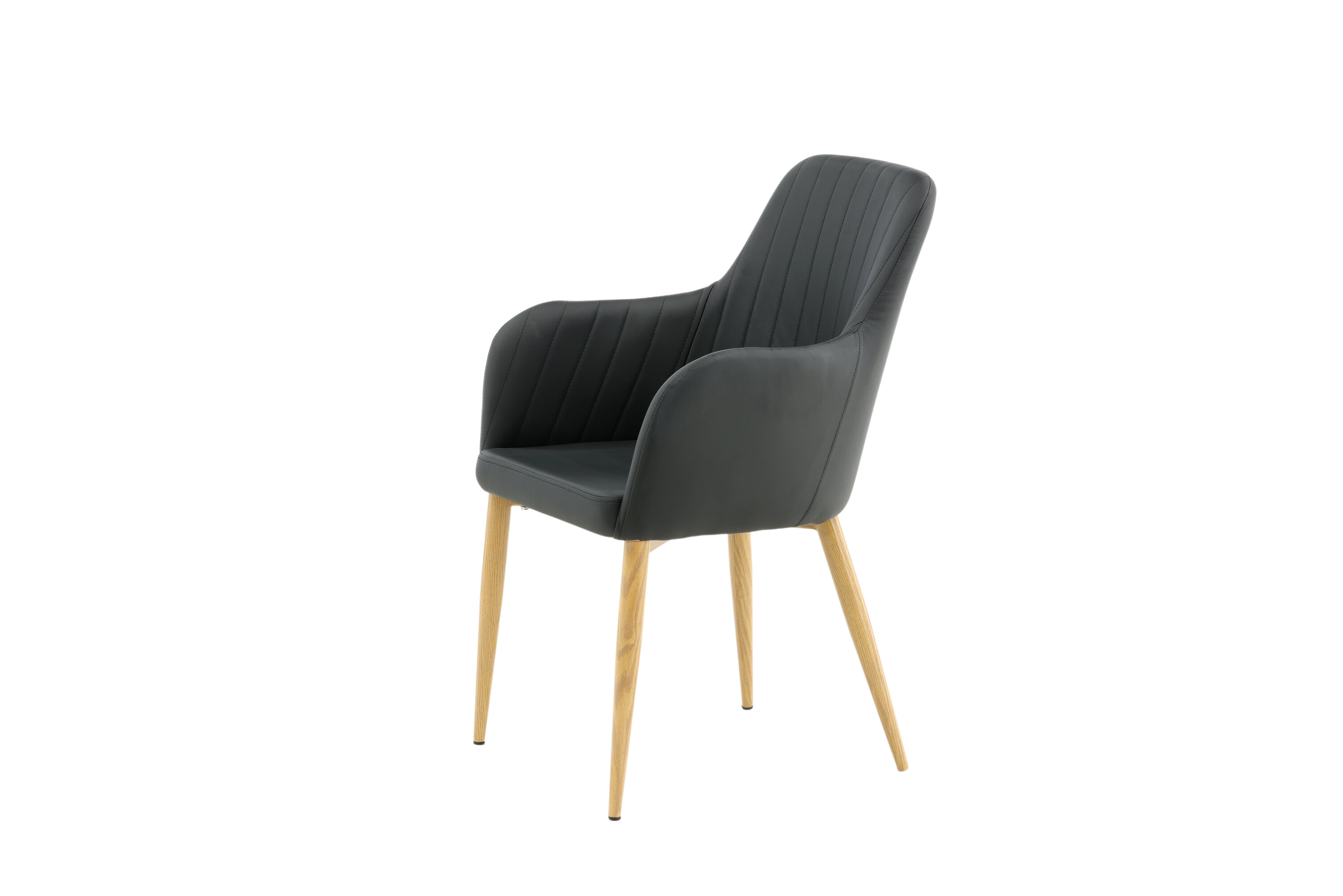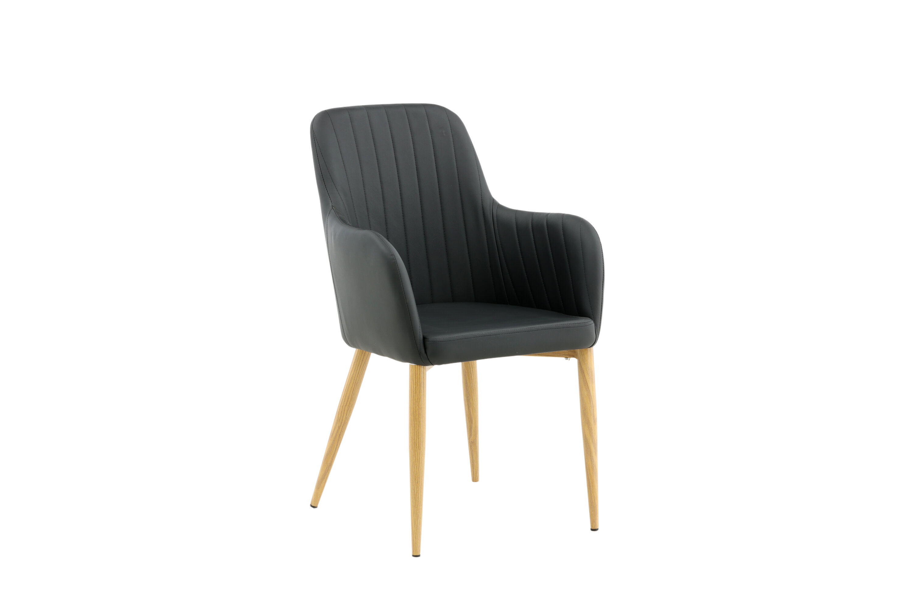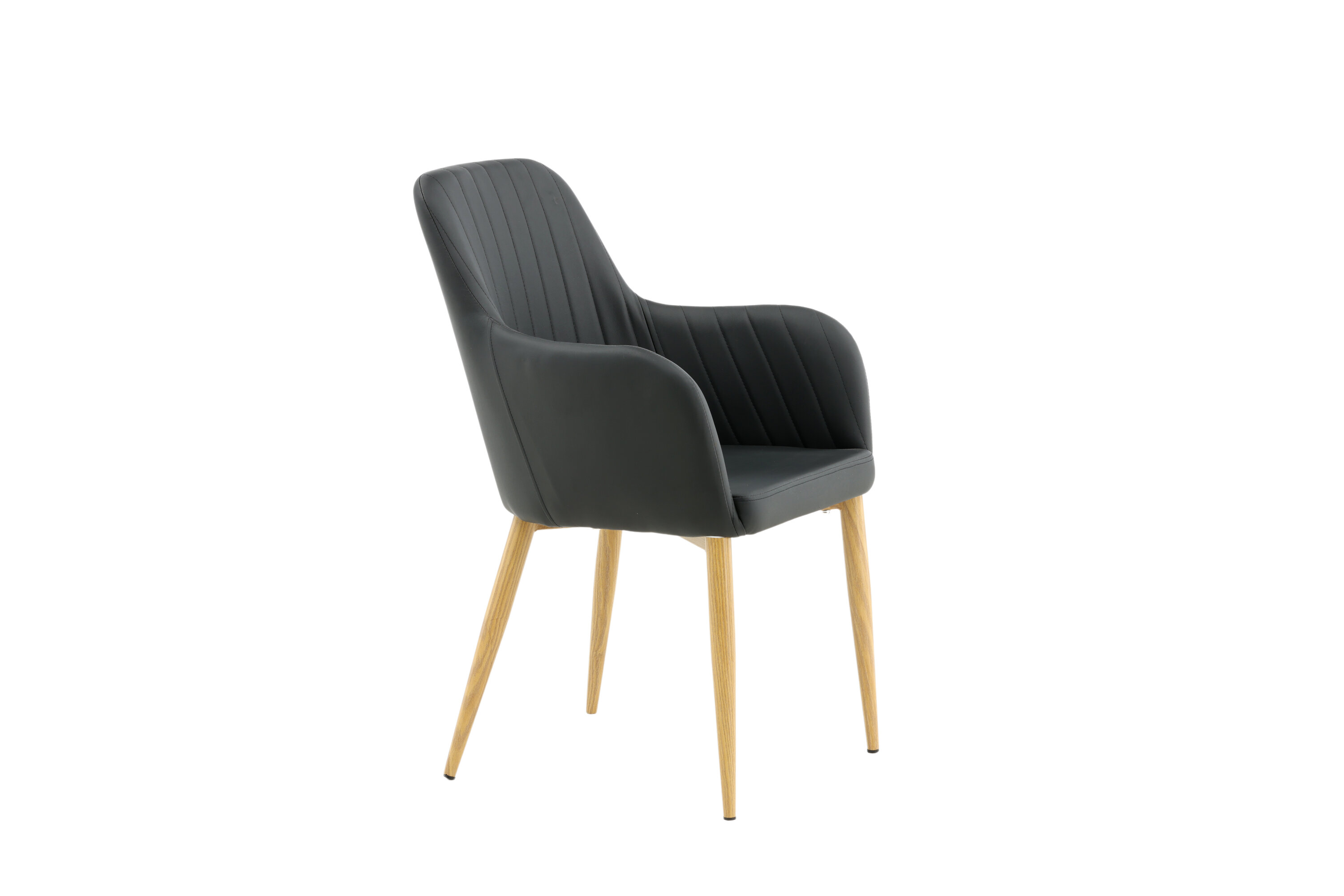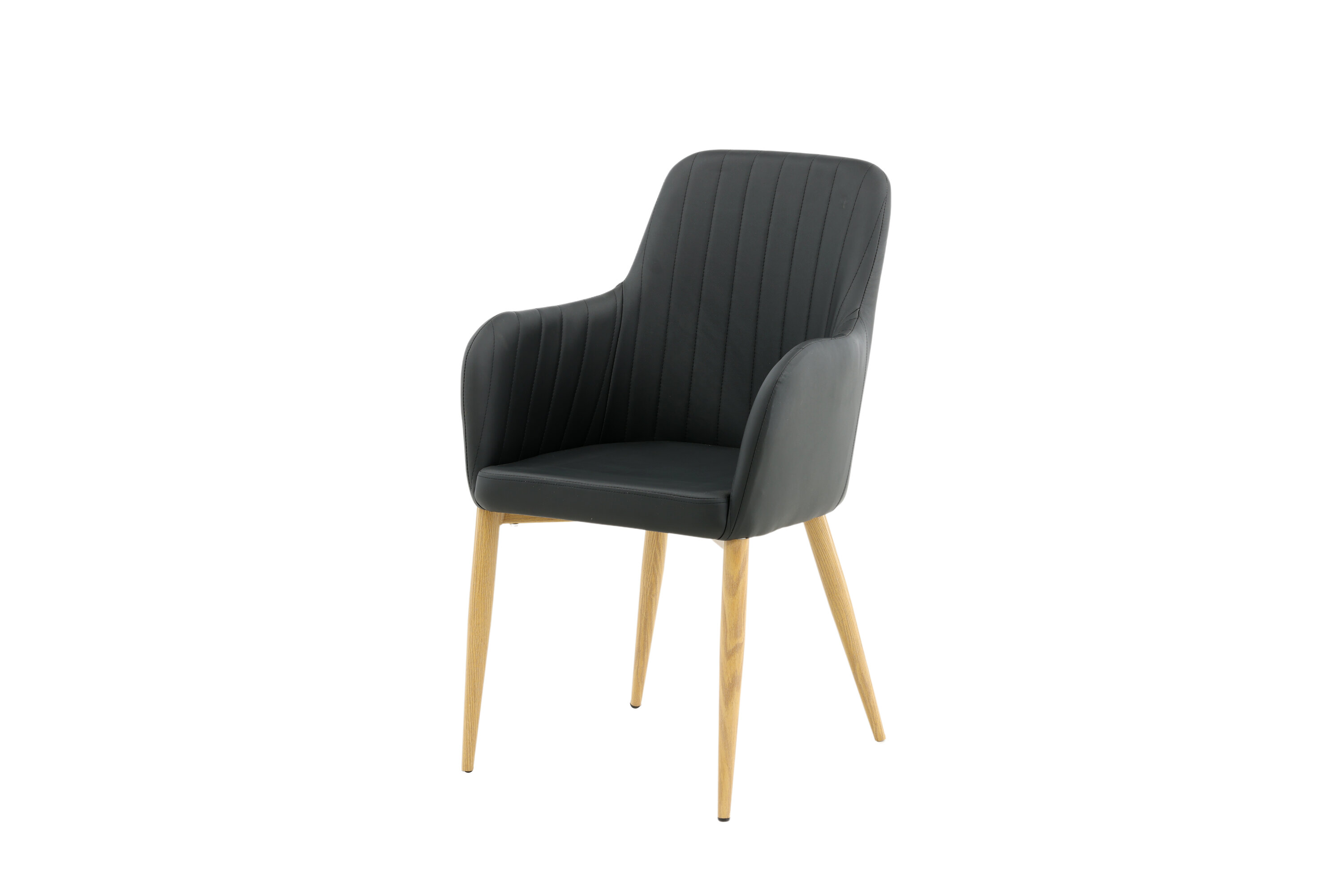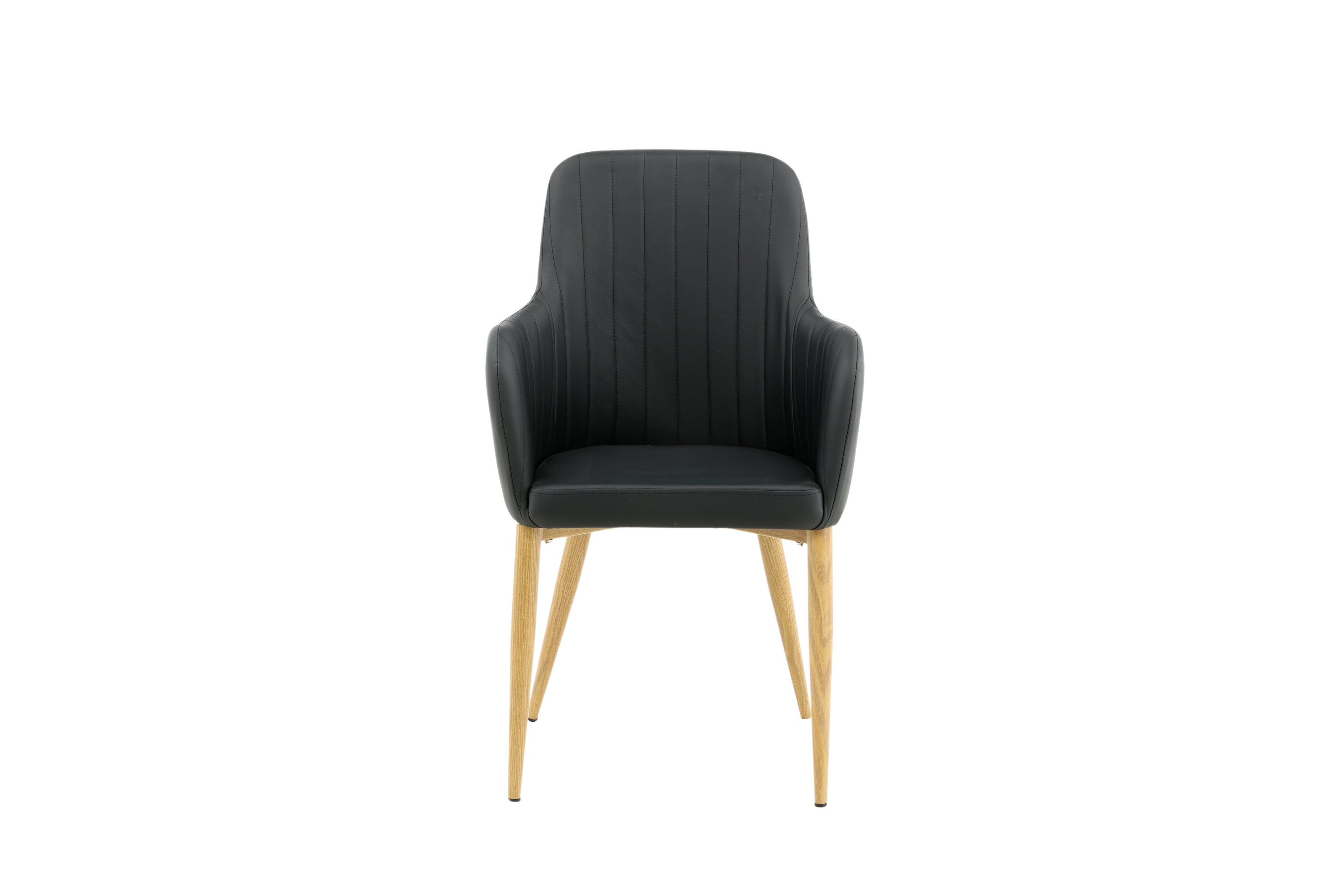 Onze heerlijke eetkamerstoel uit de Comfort-serie heeft een robuust, volledig gestoffeerd ontwerp met poten in eikenhout afgewerkt metaal. De rugleuning en zitting met geïntegreerde armleuningen zijn bekleed met zwart kunstleer voor comfortabel zitten. Decoratieve naden aan de binnenkant van de rugleuning en armleuningen voegen een stijlvol detail toe. Ga comfortabel zitten en nodig uit voor lekkere maaltijden van tevoren! Enige montage vereist.