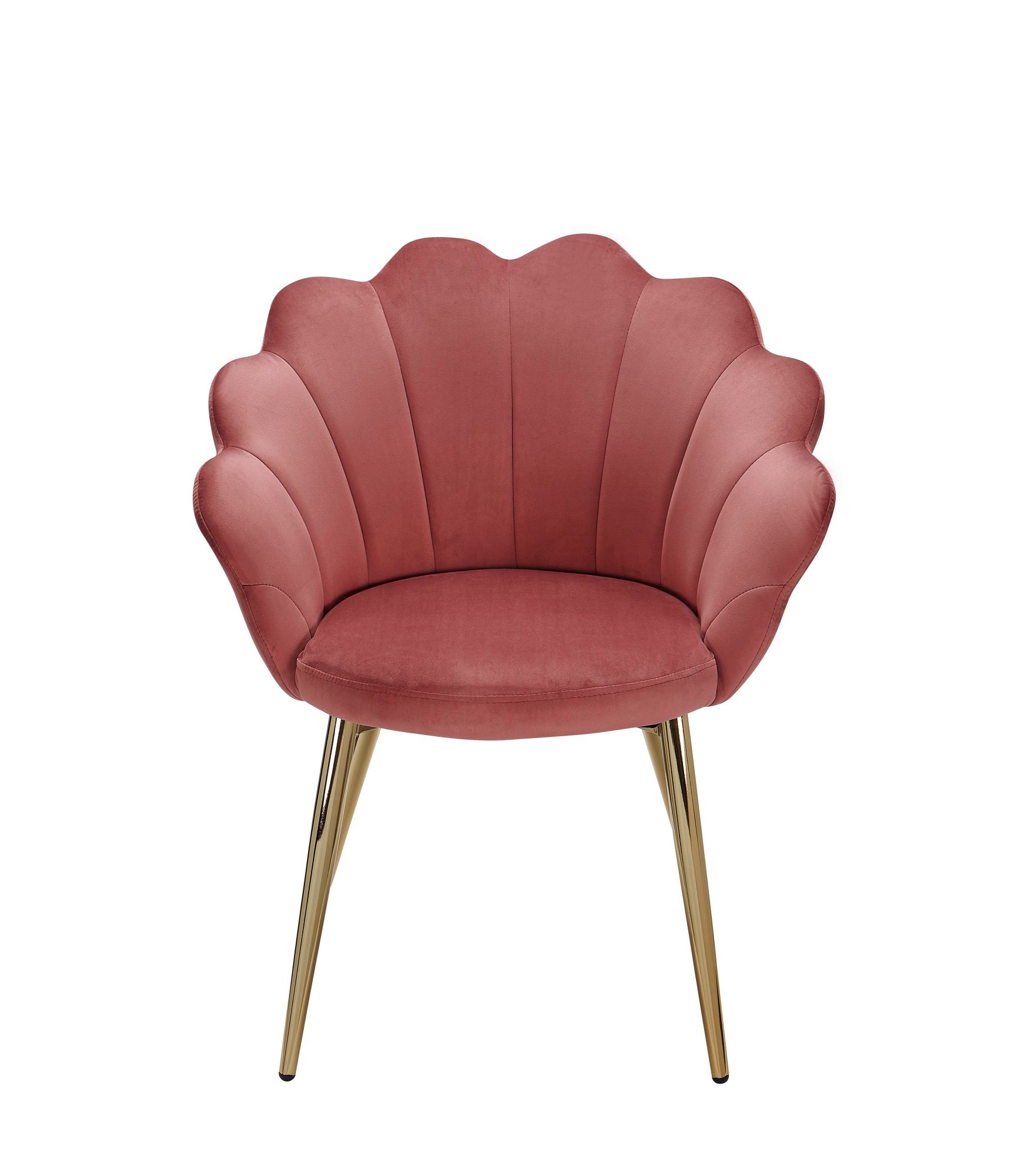 Kies voor een chique Scandinavische look met deze roze tulpenstoelen in fluweelstof, voorzien van goudkleurige gelakte ijzeren poten. De zitting met vast kussen biedt optimale ondersteuning voor comfortabel zitten aan tafel.
